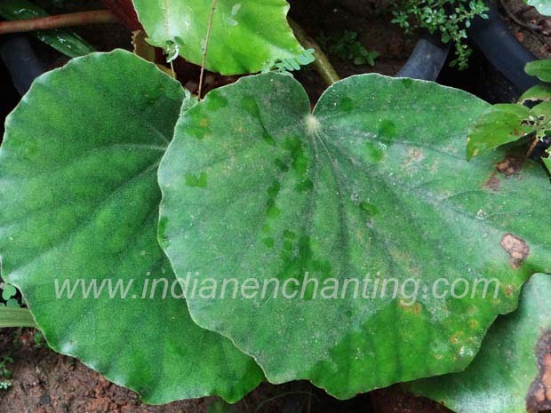 Kattukalthamara is a rhizomatous type from southern India. It has almost round leaves solidly covered with white hair on the top and bottom. It has white flowers and is interesting to grow.