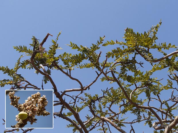 Indian Olibanum is a deciduous tree endemic to India and has been recorded on dry hills and slopes, on gravelly soils between an altitude range of 275-900 m. It is a medium sized tree, 3-5 m tall, with ash coloured papery bark. Alternately arranged leaves are pinnate, crowded at the end of branches, 20-40 cm long. There are 8-15 pairs of leaflets, 3-6 cm long, with an odd one at the tip. Leaflets are ovate, with toothed margin. Flowers are tiny, creamy, about 8 mm across, borne in 10-15 cm long racemes in leaf axils. There are 10 stamens with a short style and a 3-lobed stigma. Fruits are 2 cm long, 3-cornered. Olibanum tree, on injury, exudates an oleo-gum-resin known as Salai, Guggal or Indian Frankincense.