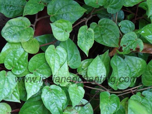 The Piper betle leaf plant is a green leafy vine that grows in India. It may climb as high as 10-15 ft. Sometimes the plant can also grow as a ground cover, the plant is very similar in growth to pepper. The Piper betle leaf prefers a warm and humid climate. The leaves are used in a number of traditional remedies for treatment of stomach ailments, infections and as a general tonic. Some research suggest that betel leaves can have immune boosting capacities.